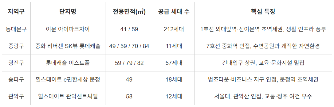 서울 전역 총 15개 단지에서 공급되며, 주요 입지와 특징은 다음과 같습니다.